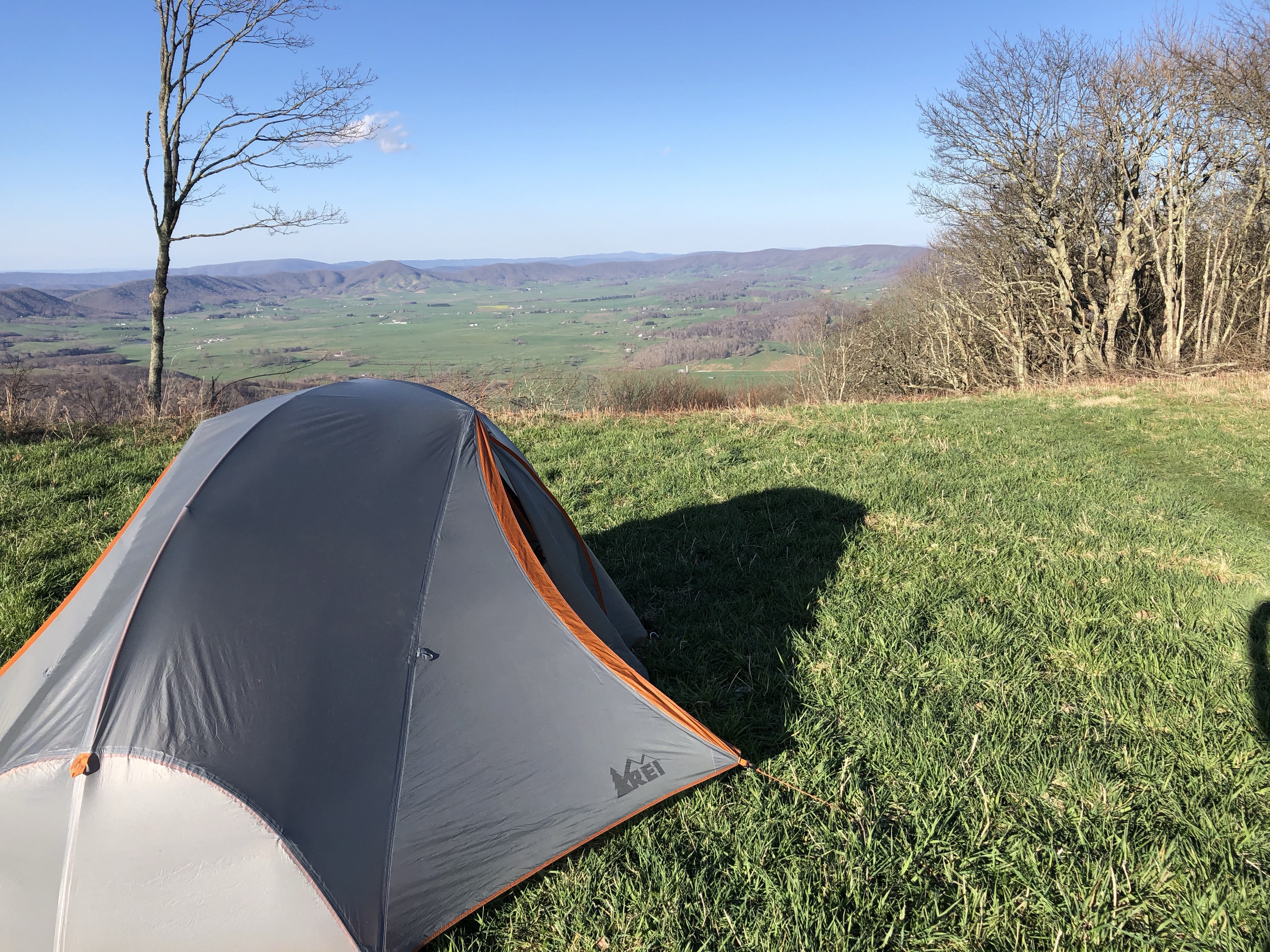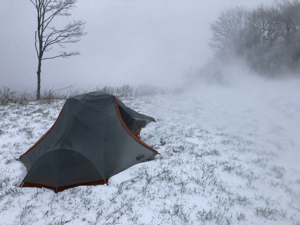 Remember all that sweet stuff about chasing spring? Geckos, butterflies and rainbows? Forget about it. Virginia pulled a fast one on us last night. I set my tent up on a beautiful field on Chestnut Knob with the plan of sipping my coffee while watching the warm sunrise from my tent. See, doesn’t this look just delightful?